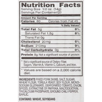 H-E-B Original Chicharrones Pork Rinds - Shop Snacks & Candy at H-E-B Nutrition Facts. Original Chicharrones Pork Rinds. about 10 Serving Per Container. Serving Size: 1/2 oz(14g) Amount Per Serving. Calories: 80 ... H-E-B Chile Lime Chicharrones Pork Rinds, 5 oz. $2.04 each ($0.41/oz) Add to list. Southern Recipe Dipper Style Pork Cracklins, 6.25 oz. $3.07 ...