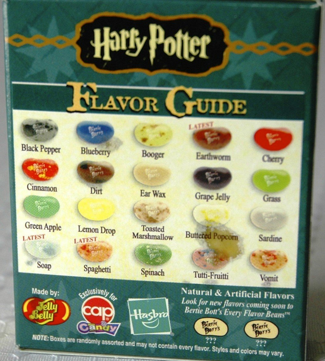 Harry Potter Candy | Bertie Bott's Jelly Beans Adventurous eaters in the muggle realm won't want to miss out out on unusual Harry Potter jelly bean flavors like Sardine, Black Pepper, Grass, Horseradish, Vomit, Earwax, Earthworm, Spaghetti, Spinach, Soap, Sausage, Pickle and Bacon. Weird, Wild and Downright Delicious Bertie Bott's Beans Jelly Belly Expands Famed Line, Unveils All-New Harry Potter™ Licensed ... Filled with only unusual flavors such as Soap, Black Pepper and Dirt. Flavors are packed into individual compartments. 1.2-oz. Flip Top Box and 1.9-oz. Grab & Go Bag Includes all 20 flavors ranging from delicious to bizarre, featuring iconic flavors Candyfloss and Earwax. Includes flavor guide on each package. Chocolate Frogs