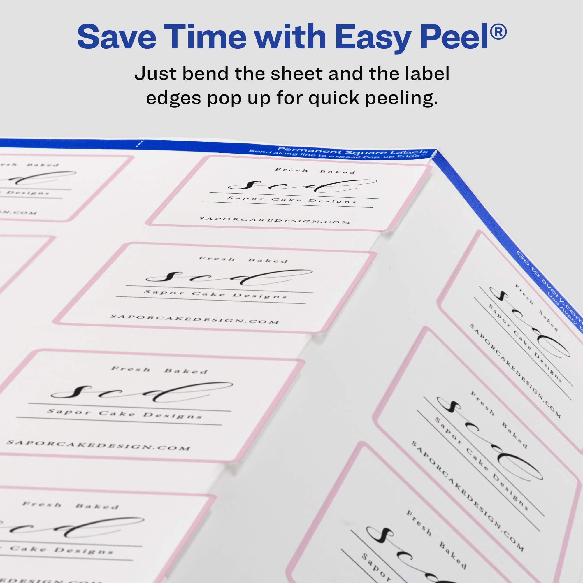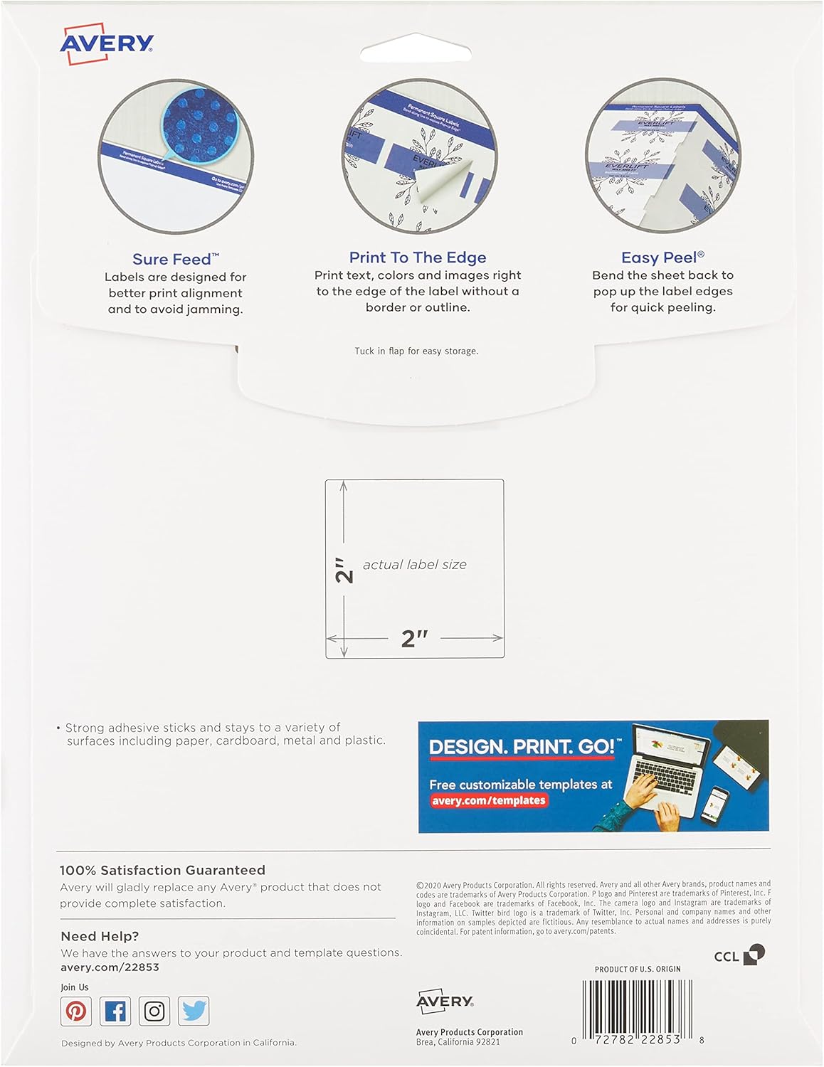 Avery Easy Peel Laser/Inkjet Print-to-the-Edge Specialty Labels, 2" x 2 ... Compatibility with laser or inkjet printers and the print-to-the-edge design of these Avery Easy Peel labels lets you add color, text or logos that cover the entire label. Ideal for product branding, party favors and decorations, crafts, addressing and labeling food containers Individual labels measure 2"H x 2"W White color for an attractive look