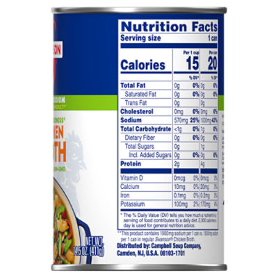 Swanson chicken broth nutrition facts. Swanson Chicken Broth: Calories, Nutrition Analysis & More the container states 20 cal per serving..4 servings per box. serving is 1 cup. No rating. caitlinwrhodes. Chicken Broth - Swanson - Campbell Soup Company This broth is 99% fat-free with no MSG added*, and has 1/3 less sodium than our regular chicken broth**. *Small amount of glutamate occurs naturally in yeast ... Calories in Swanson Chicken Broth and Nutrition Facts 14 Jul 2020 — Chicken Broth ; Calories. 10 ; Fat. 0 g ; Carbs. 1 g ; Protein. 1 g ; Serving Size, 1 cup (240 ml) ...