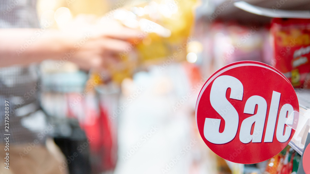 Red Sale Label On Product Shelf In Supermarket With Blurred ...