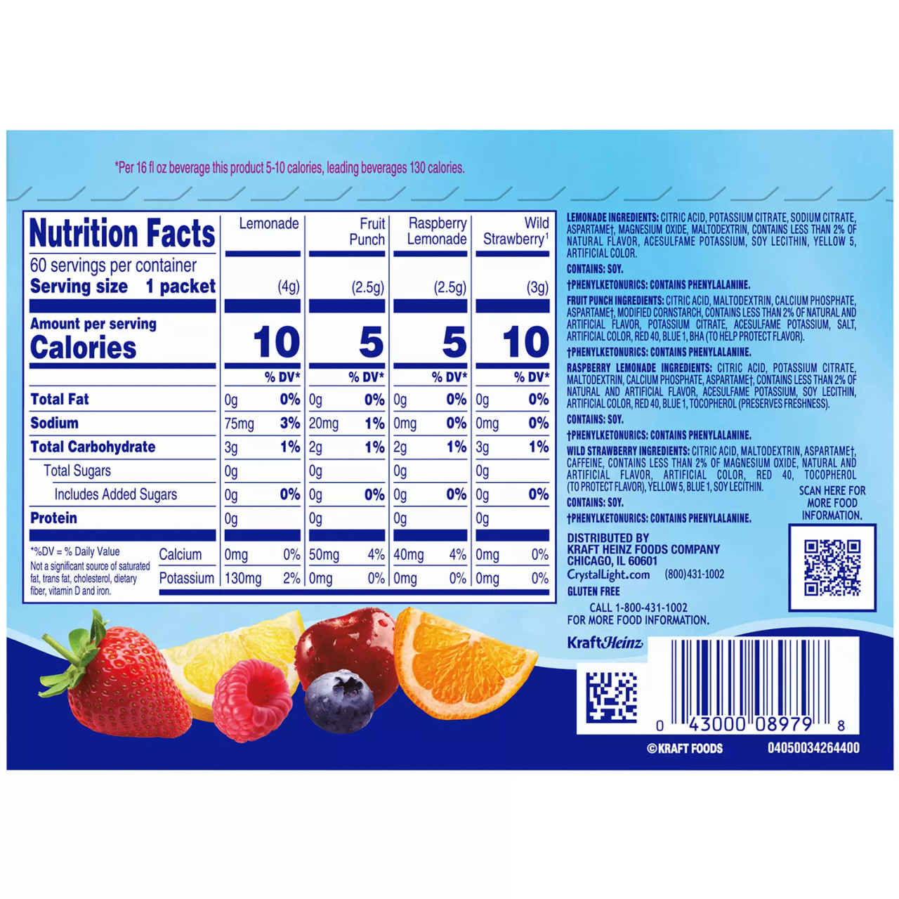 Calories in Crystal Light - Calorie, Fat, Carb, Fiber, & Protein Info Calories, Fat, Protein, Fiber, & Carbs In Crystal Light Wild Strawberry Calories, Fat, Protein, Fiber, & Carbs In Crystal Light Energy 2400 Calorie Vegetarian Weight Loss Meal Plan