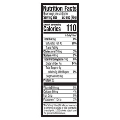 Nutrition Facts for Breyers Carb Smart Vanilla Ice Cream Carb Smart Vanilla Ice Cream Nutrition Facts Serving Size cup 2/3 cup = 78g Amount Per Serving 110 Calories % Daily Value* 9% Total Fat 6g 20% Saturated Fat 4g Trans Fat 0g 3% Cholesterol 10mg 2% Sodium 40mg 5% Total Carbohydrate 16g 14% Dietary Fiber 4g Total Sugars 4g 0% Includes 0g Added Sugars Sugar Alcohols 8g Protein 2g 0% Vitamin D 0mcg