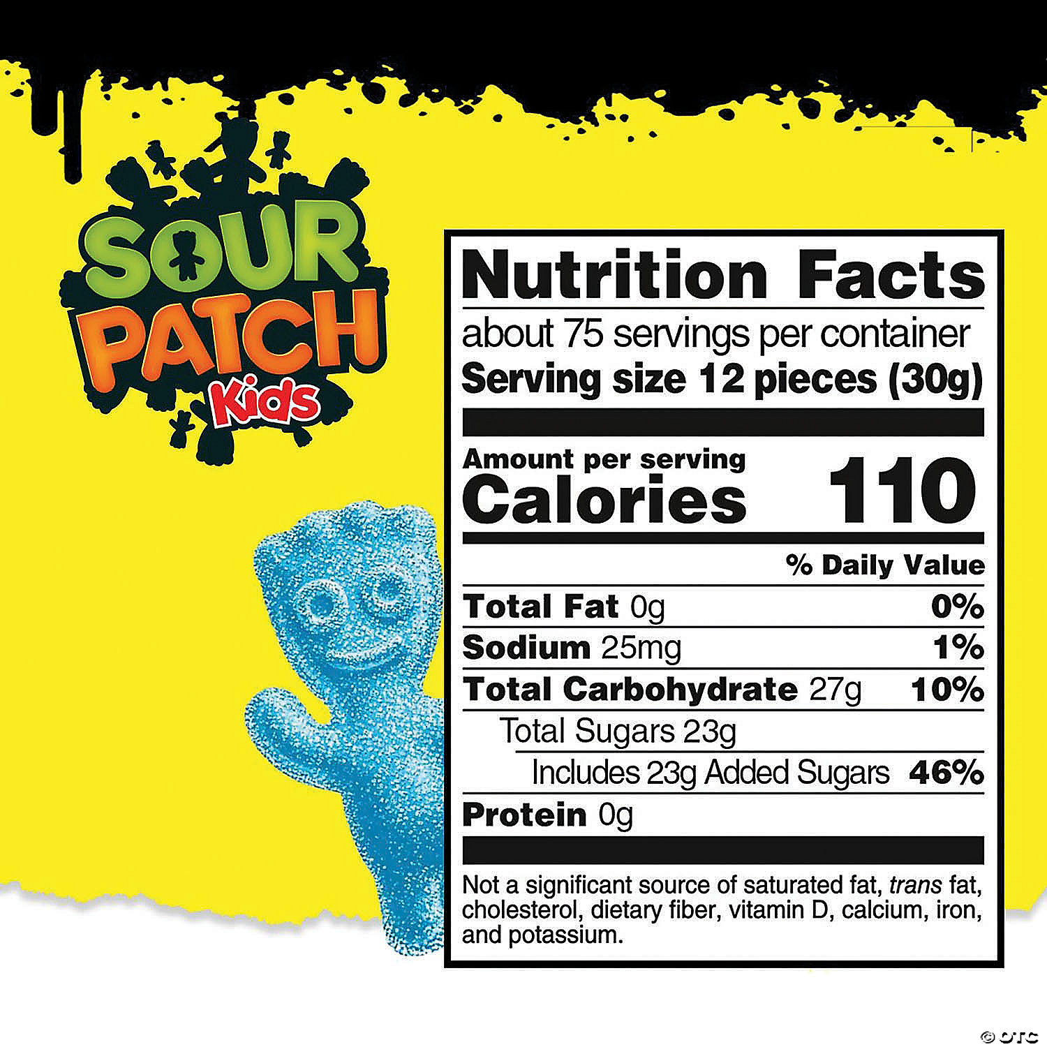 Sour Patch Kids Soft & Chewy Candy Share Size - Giant Per 12 Pieces: 110 calories; 0 g sat fat (0% DV); 25 mg sodium (1% DV); 24 g total sugars. Contains a bioengineered food ingredient. Sour then sweet. Sour.
