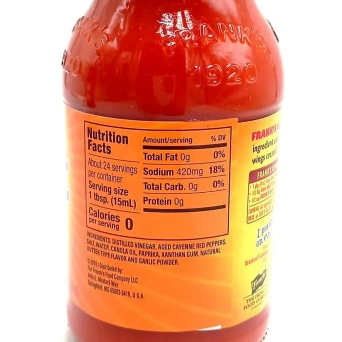 Frank's red hot ingredients label. Frank's RedHot Hot Sauce - Original, 12 oz - Walmart.com WebRefer to the product label for full dietary information, which may be available as an alternative product image. ... Our sauce is essential at tailgates, parties, cookouts, you name it. Frank’s Hot Sauce is a recipe that has been tantalizing taste buds since 1964, and it’s not stopping anytime soon. Hot sauce is an inherently calorie free ... Unbanked American households hit record low numbers in 2021 WebOct 25, 2022 · Those who have a checking or savings account, but also use financial alternatives like check cashing services are considered underbanked. The underbanked represented 14% of U.S. households, or 18. ... Buffalo Chicken Wing Sauce - Allrecipes WebSep 30, 2022 · Buffalo sauce and hot sauce are not the same thing. Hot sauce is a spicy blend of cayenne pepper, vinegar, and salt. Buffalo sauce, meanwhile, is hot sauce that's been enhanced with butter and other ingredients. Buffalo sauce is much richer and smoother than regular hot sauce. It's used as a dipping sauce or a condiment. Frank’s RedHot Ingredients: What’s In It? - PepperScale WebMay 05, 2017 · In order to get a better understanding of what makes this hot sauce so iconic, we should take look at what goes into it. Ingredients in Frank’s RedHot Original Cayenne Pepper Sauce. The label on the Original Cayenne Pepper Sauce bottle shows these ingredients: Aged Cayenne Red Peppers; Distilled Vinegar; Water; Salt; Garlic …
