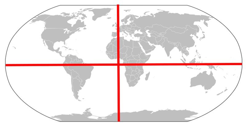 World map labeled equator and prime meridian