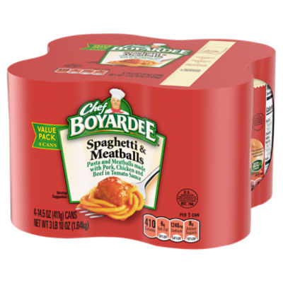 Chef Boyardee Calories and Nutrition Information. Page 1 1 bowl. 220. Beefaroni, Pasta in Tomato and Meat Sauce. 1 cup. 250. Bef Ravioli in Tomato and Meat Sauce. 1 cup. 240. Big Beefaroni Pasta in Tomato and Meat Sauce. Spaghetti & Meatballs Can | Chef Boyardee Spaghetti & Meatballs Can | Chef Boyardee Spaghetti & Meatballs Can 3.2 (146) Write a review Enjoy the Chef's famous-recipe pasta and meatballs in a signature tomato sauce. See ingredients, nutrition, and other product information here Buy Now Tell your friends: You May Also Like Spaghetti & Meatballs, 4 pk. (0) Chicken Alfredo Can (43)