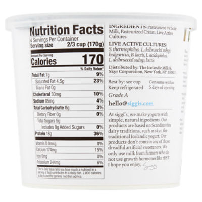 Yogurt Probiotics Guide: Nutrition and Main Benefits | Signos Best Yogurt Probiotics, According to Signos. Siggis Icelandic Yogurt. The flavored options are lower in sugar than most store-bought options, and Siggis has a low-sugar option sweetened with stevia. Siggis uses live active cultures like L. acidophilus and Bifidobacterium in its starter cultures. Stonyfield Organic Plain Whole Milk Probiotic Yogurt. Does Siggis Yogurt Have Probiotics - ProbioticsTalk.com Nutrition: 5.3 oz, 120 calories, 5 g fat , 95 mg sodium, 5 g carbs , 14 g protein, 20% DV calcium We love that Stonyfield recently introduced a full-fat version to their Greek line. siggi's Icelandic yogurt - Home One serving of siggi's skyr uses 4x the amount of milk as a regular cup of yogurt, making a thick, protein-rich yogurt. see our process try our plant-based products Made with a not-too-sweet concoction of coconut, macadamia, and pea protein, our plant-based coconut blend is rich, creamy, satisfying, and delicious. learn more where to buy Siggi's Icelandic Yogurt Product Review Siggi's yogurt nutrition labels speak for themselves: Siggi's Skyr Icelandic Style Strained Non-Fat Yogurt Nutrition Facts Available On Amazon What are you doing to improve your diet? Try one of Siggi's Icelandic yogurts today and see if it fits your lifestyle. By Corey Lewis, CPT, CSCS See All Food Supplements
