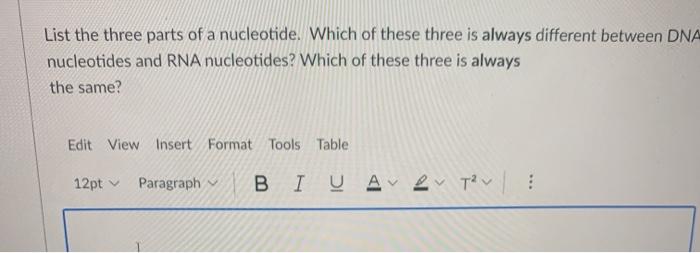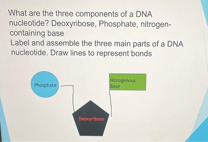 What are the Three Main Parts of a Nucleotide? - BYJU'S There are a total of five bases found in the DNA and RNA world, namely - Adenine (A), Cytosine (C), Guanine (G), Thymine (T) and Uracil (U). A, T, C and G are found in DNA molecules whereas the uracil base is found in RNA molecules in place of the thymine. Phosphate Group 2.6: DNA and RNA Flashcards | Quizlet A nucleotide has three component parts: 1. a nitrogenous base 2. A 5-carbon sugar (ribose or deoxyribose) 3. A phosphate group Identify and label carbons by number (for example, C1, C2, C3) on a nucleotide drawing. Understanding: The nucleic acids DNA and RNA are polymers of nucleotides.